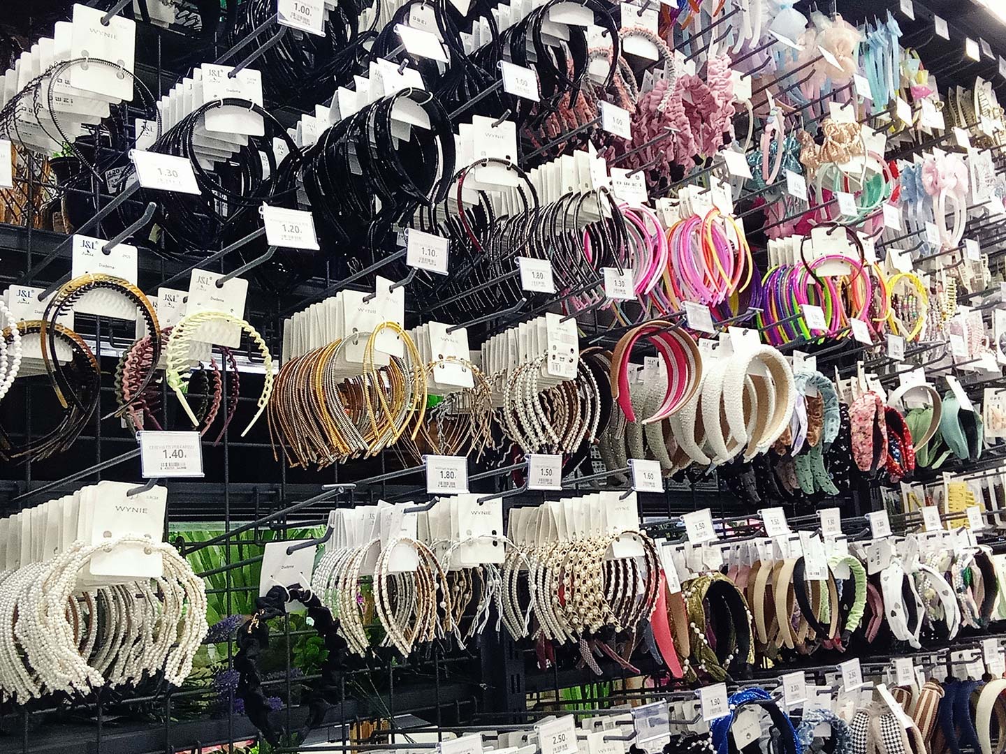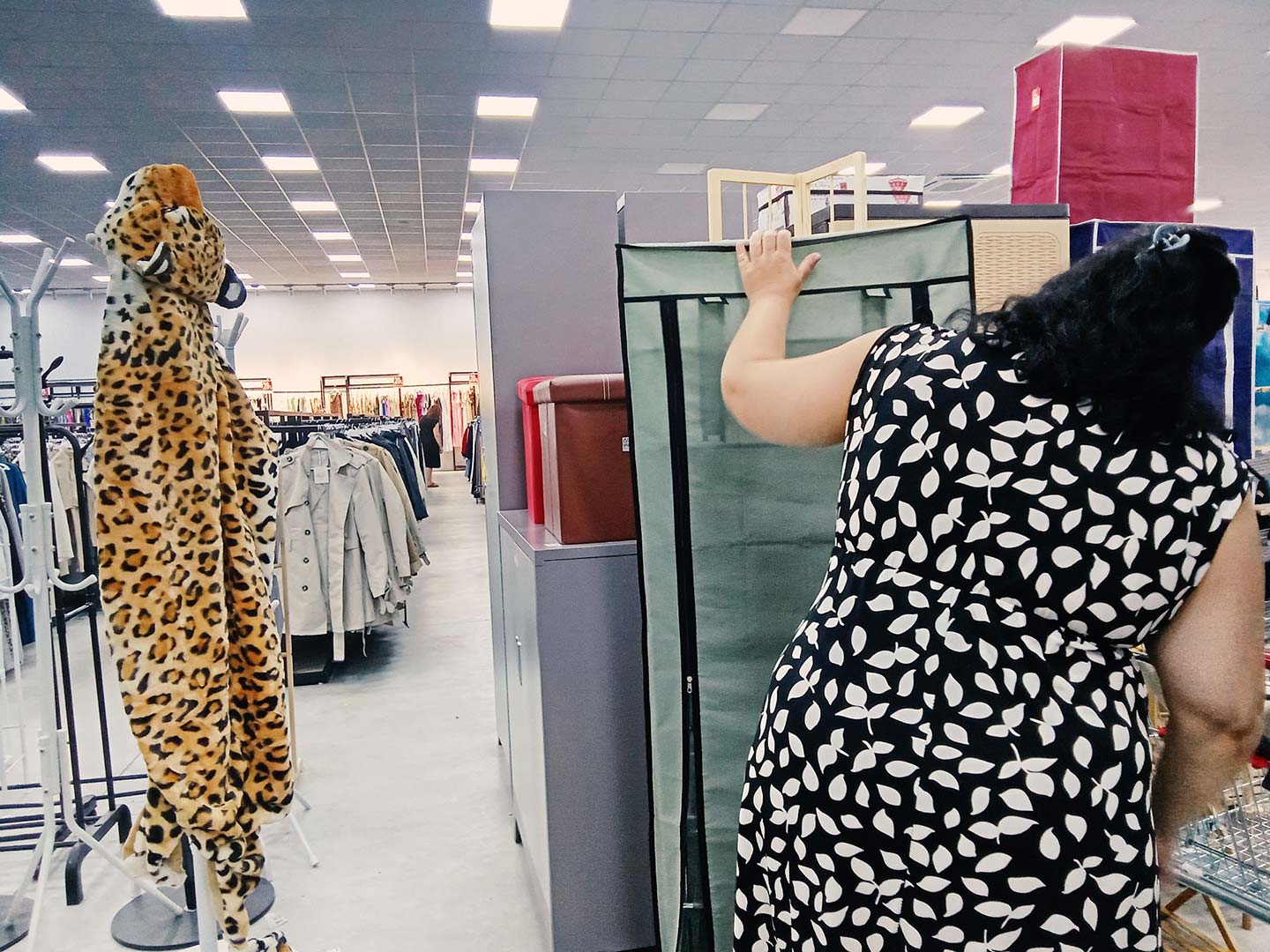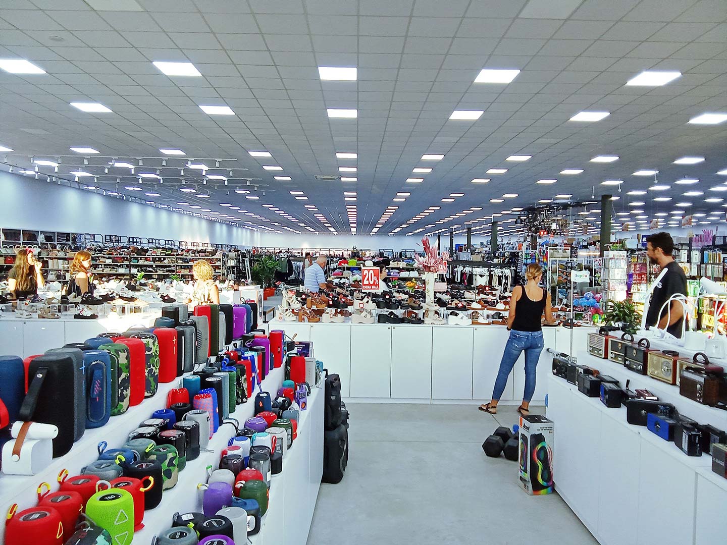 Σε αυτόν τον διάδρομο-αποθήκη εκτίθενται, με στρατιωτική ακρίβεια και ακαριαία αναγνωσιμότητα ανά είδος, δεκάδες χιλιάδες αντικείμενα ευρείας κατανάλωσης. Σχεδόν ό,τι μπορεί να συλλάβει ο νους: παιχνίδια, οικιακά σκεύη και είδη κουζίνας, χαρτικά και σχολικά, καλλυντικά και μικροεργαλεία, φωτιστικά, υαλικά, μπουρνούζια, παντόφλες, σαγιονάρες, φόρμες και εσώρουχα, παπούτσια και παπουτσοθήκες, τσάντες και πορτοφόλια, πλαστικά λουλούδια, κλουβιά για καναρίνια, εργαλεία για το σπίτι και το αυτοκίνητο, μέχρι και δώρα για ερωτευμένους. Ένα μικρό σύμπαν καθημερινότητας, ταξινομημένο σε σειρές που μοιάζουν να μην τελειώνουν.