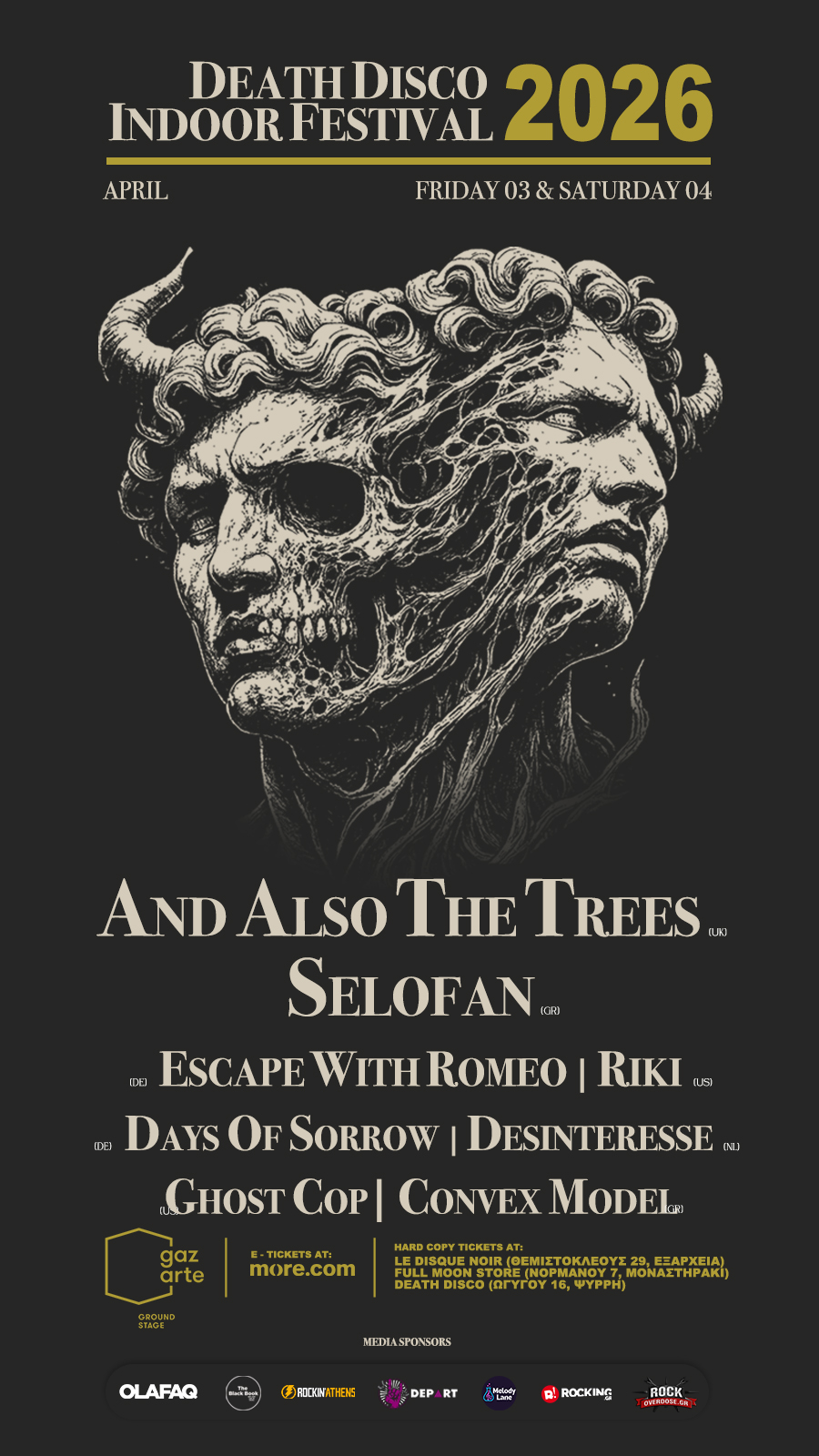 Με headliners τους αγαπημένους μας Βρετανούς And Also The Trees και τους δικούς μας Selofan, με συγκροτήματα που για πρώτη φορά επισκέπτονται την Ελλάδα όπως οι Escape With Romeo και οι Days Of Sorrow από τη Γερμανία, οι Riki και Ghost Cop από την Αμερική, και οι ολλανδοί Desinteresse, αλλά και οι γνώριμοι Convex Model από τη Θεσσαλονίκη, το Death Disco Indoor Festival 2026 συνεχίζει τη παράδοση να συνδυάζει σχήματα που έχουν ήδη αγαπηθεί από το ελληνικό κοινό αλλά και νέα ονόματα που το ένστικτό μας λέει πως θα καθιερωθούν σύντομα στο post punk, darkwave, synth, goth στερέρωμα.